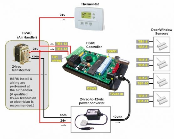 The HSRS is ideally suited for use with split (central / ducted) systems. We recommend installing the HSRS controller near the air handler, and routing a length of low-voltage wire into the HVAC unit for direct access to the 24vac power. (Most types of low voltage wire will suffice such as thermostat, telephone, intercom, or alarm wire.) For wiring details, including sample schematic click here.